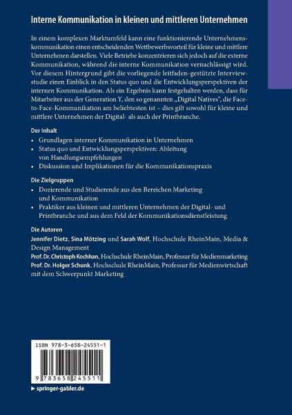 In einem komplexen Marktumfeld kann eine funktionierende Unternehmenskommunikation einen entscheidenden Wettbewerbsvorteil für kleine und mittlere Unternehmen darstellen. Viele Betriebe konzentrieren sich jedoch auf die externe Kommunikation, während die interne Kommunikation vernachlässigt wird. Vor diesem Hintergrund gibt die vorliegende leitfaden-gestützte Interviewstudie einen Einblick in den Status quo und die Entwicklungsperspektiven der internen Kommunikation. Als ein Ergebnis kann festgehalten werden, dass für Mitarbeiter aus der Generation Y, den so genannten "Digital Natives", die Face-to-Face-Kommunikation am beliebtesten ist - dies gilt sowohl für kleine und mittlere Unternehmen der Digital- als auch der Printbranche.