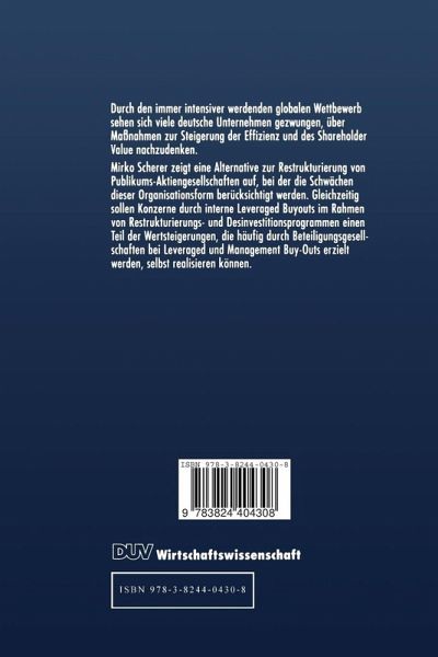 Restrukturierungen von Publikums aktiengesellschaften haben in den vergangenen Jahren aufgrund der zunehmenden Internationalisierung der Gütermärkte und der gewachsenen Bedeutung der Kapitalmärkte auch in Deutschland an Bedeutung gewonnen. Die Häufigkeit dieser Transaktionen ist jedoch, nicht zuletzt durch die in Deutschland sehr kontrovers geführte Shareholder Value Diskussion, noch weit geringer als in den USA und Großbritannien. Diese noch immer bestehende Zurückhaltung bei der Neuausrichtung von deutschen Publikumsaktiengesellschaften hat in der Mehrzahl der Fälle negative Auswirkungen auf die internationale Wettbewerbsfähigkeit und damit unerwünschte volkswirtschaftliche Effekte. Ziel dieser Arbeit ist es, eine neuartige Alternative zur Restrukturierung von deutschen Publikumsaktiengesellschaften aufzuzeigen, die viele der in der Wissenschaft und in der Unternehmenspraxis diskutierten Einwände berücksichtigt. Dieser als Interner Leveraged Buy-out bezeichnete Weg soll eine langfristige Wertsteigerung durch die Übernahme von erfolgreich erprobten Bestandteilen von Leveraged und Management Buy-outs und die Beseitigung von in der Literatur vielfach zitierten Schwachstellen der deutschen Ausprägung der Publikumsaktiengesellschaft ermöglichen. Als Folge eines erfolgreichen Internen Leveraged Buy-outs können sich nicht nur langfristige Wertsteigerungen für die beteiligten Unternehmen und die Finanzinvestoren ergeben, sondern es sind vor allem volkswirtschaft lich vorteilhafte Impulse zu erwarten.