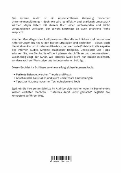Das interne Audit ist ein unverzichtbares Werkzeug moderner Unternehmensführung - doch wie wird es effektiv und praxisnah umgesetzt? Wilfried Meyer liefert mit diesem Buch einen umfassenden und leicht verständlichen Leitfaden, der sowohl Einsteiger als auch erfahrene Profis anspricht.Von den Grundlagen des Auditprozesses über die rechtlichen und normativen Anforderungen bis hin zu den besten Strategien und Techniken - dieses Buch bietet einen klar strukturierten Überblick und wertvolle Einblicke in alle Aspekte des internen Audits. Mithilfe praktischer Beispiele, Checklisten und Tipps erfahren Sie, wie Sie Audits effizient planen, durchführen und dokumentieren. Gleichzeitig zeigt der Autor, wie internes Audit nicht nur Risiken minimiert, sondern auch zur Wertsteigerung im Unternehmen beiträgt.Dieses Buch ist Ihr Schlüssel zu einem erfolgreichen internen Audit:Perfekte Balance zwischen Theorie und PraxisAnschauliche Fallstudien und leicht umsetzbare EmpfehlungenTipps zur Nutzung moderner Technologien und ToolsEgal, ob Sie Ihre ersten Schritte im Auditbereich machen oder Ihr bestehendes Wissen vertiefen möchten - "Internes Audit leicht gemacht" begleitet Sie kompetent auf Ihrem Weg.