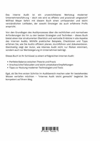 Das interne Audit ist ein unverzichtbares Werkzeug moderner Unternehmensführung - doch wie wird es effektiv und praxisnah umgesetzt? Wilfried Meyer liefert mit diesem Buch einen umfassenden und leicht verständlichen Leitfaden, der sowohl Einsteiger als auch erfahrene Profis anspricht.Von den Grundlagen des Auditprozesses über die rechtlichen und normativen Anforderungen bis hin zu den besten Strategien und Techniken - dieses Buch bietet einen klar strukturierten Überblick und wertvolle Einblicke in alle Aspekte des internen Audits. Mithilfe praktischer Beispiele, Checklisten und Tipps erfahren Sie, wie Sie Audits effizient planen, durchführen und dokumentieren. Gleichzeitig zeigt der Autor, wie internes Audit nicht nur Risiken minimiert, sondern auch zur Wertsteigerung im Unternehmen beiträgt.Dieses Buch ist Ihr Schlüssel zu einem erfolgreichen internen Audit:Perfekte Balance zwischen Theorie und PraxisAnschauliche Fallstudien und leicht umsetzbare EmpfehlungenTipps zur Nutzung moderner Technologien und ToolsEgal, ob Sie Ihre ersten Schritte im Auditbereich machen oder Ihr bestehendes Wissen vertiefen möchten - "Internes Audit leicht gemacht" begleitet Sie kompetent auf Ihrem Weg.
