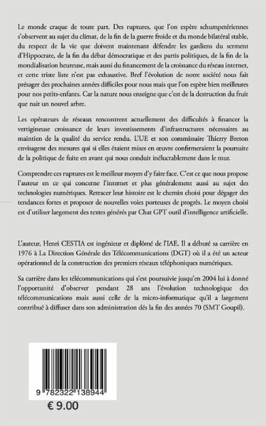 Le monde craque de toute part. Des ruptures, que l'on espère schumpétériennes s'observent au sujet du climat, de la fin de la guerre froide et du monde bilatéral stable, du respect de la vie que doivent maintenant défendre les gardiens du serment d'Hippocrate, de la fin du débat démocratique et des partis politiques, de la fin de la mondialisation heureuse. Bref l'évolution de notre société nous fait présager des prochaines années difficiles pour nous mais que l'on espère bien meilleures pour nos petits enfants. Car la nature nous enseigne que c'est de la destruction du fruit que nait un nouvel arbre.C'est dans ce contexte que, cerise sur le gâteau, les opérateurs de réseaux rencontrent actuellement des difficultés à financer la vertigineuse croissance de leur investissements d'infrastructure nécessaires au maintien de la qualité du service rendu par l'internet.L'UE et son commissaire T. Breton envisagent des mesures qui si elles étaient mises en oeuvre confirmerait la poursuite de la politique de fuite en avant qui nous conduit inéluctablement dans le mur.Comprendre ces ruptures est le meilleur moyen d'y faire face. c'est ce que nous propose l'auteur au sujet du réseau internet et plus généralement des technologies numériques. Retracer leur histoire est le chemin choisi pour dégager des tendances fortes et proposer de nouvelles voies porteuses de progrès. Le moyen choisi est d'utiliser largement des textes générés par Chat GPT outil d'intelligence artificielle.