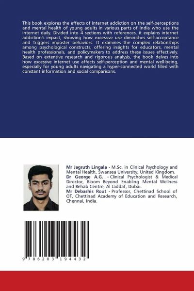 This book explores the effects of internet addiction on the self-perceptions and mental health of young adults in various parts of India who use the internet daily. Divided into 4 sections with references, it explains internet addiction's impact, showing how excessive use diminishes self-acceptance and triggers imposter behaviors. It examines the complex relationships among psychological constructs, offering insights for educators, mental health professionals, and policymakers to address these issues effectively. Based on extensive research and rigorous analysis, the book delves into how excessive internet use affects self-perception and mental well-being, especially for young adults navigating a hyper-connected world filled with constant information and social comparisons.