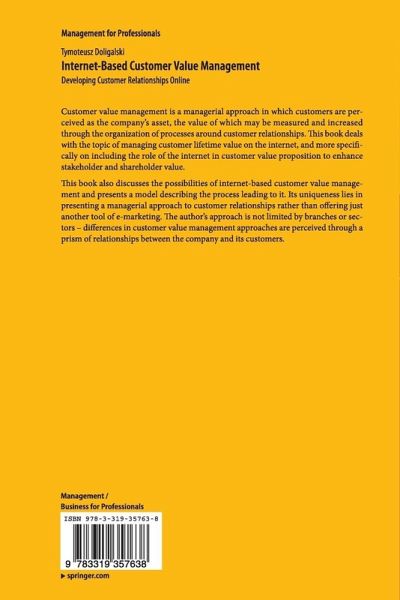 Customer value management is a managerial approach in which customers are perceived as the company's asset, the value of which may be measured and increased through the organization of processes around customer relationships. This book deals with the topic of managing customer lifetime value on the internet, and more specifically on including the role of the internet in customer value proposition to enhance stakeholder and shareholder value.