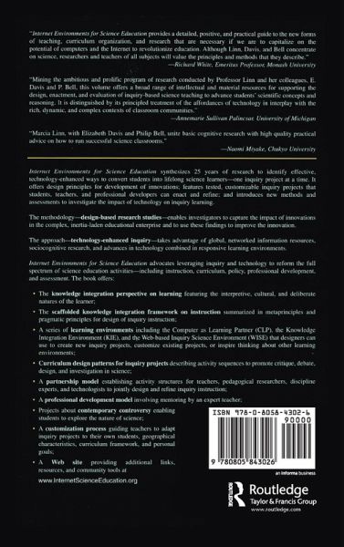 Internet Environments for Science Education synthesizes 25 years of research to identify effective, technology-enhanced ways to convert students into lifelong science learners--one inquiry project at a time. It offers design principles for development of innovations; features tested, customizable inquiry projects that students, teachers, and professional developers can enact and refine; and introduces new methods and assessments to investigate the impact of technology on inquiry learning. The methodology--design-based research studies--enables investigators to capture the impact of innovations in the complex, inertia-laden educational enterprise and to use these findings to improve the innovation. The approach--technology-enhanced inquiry--takes advantage of global, networked information resources, sociocognitive research, and advances in technology combined in responsive learning environments. Internet Environments for Science Education advocates leveraging inquiry and technology to reform the full spectrum of science education activities--including instruction, curriculum, policy, professional development, and assessment. The book offers: *the knowledge integration perspective on learning, featuring the interpretive, cultural, and deliberate natures of the learner; *the scaffolded knowledge integration framework on instruction summarized in meta-principles and pragmatic principles for design of inquiry instruction; *a series of learning environments, including the Computer as Learning Partner (CLP), the Knowledge Integration Environment (KIE), and the Web-based Inquiry Science Environment (WISE) that designers can use to create new inquiry projects, customize existing projects, or inspire thinking about other learning environments; *curriculum design patterns for inquiry projects describing activity sequences to promote critique, debate, design, and investigation in science; *a partnership model establishing activity structures for teachers, pedagogical researchers, discipline experts, and technologists to jointly design and refine inquiry instruction; *a professional development model involving mentoring by an expert teacher; *projects about contemporary controversy enabling students to explore the nature of science; *a customization process guiding teachers to adapt inquiry projects to their own students, geographical characteristics, curriculum framework, and personal goals; and *a Web site providing additional links, resources, and community tools at www.InternetScienceEducation.org