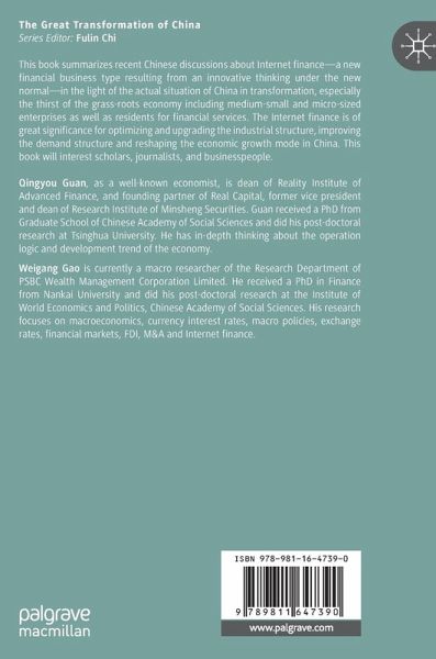 This book summarizes recent Chinese discussions about Internet finance-a new financial business type resulting from an innovative thinking under the new normal-in the light of the actual situation of China in transformation, especially the thirst of the grass-roots economy including medium-small and micro-sized enterprises as well as residents for financial services. The Internet finance is of great significance for optimizing and upgrading the industrial structure, improving the demand structure and reshaping the economic growth mode in China. This book will interest scholars, journalists, and businesspeople.