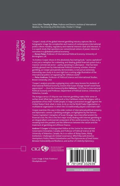 'Cooper's study of the global Internet gambling industry captures like in a holographic image the complexities and nuance of contemporary international politics where morality, regulatory and material interests clash and intersect. It is a superb study that questions our conventional notions of power, interest or outcomes in a globalized political economy.' - Ronen Palan, Professor of International Political Economy, University of Birmingham, UK 'As Andrew Cooper shows in this absolutely fascinating book, "casino capitalism" is not just a metaphor for a wheeling-and-dealing global financial system but a massive commercial sector - partly operating in cyberspace - that has been entirely glossed over by International Political Economy scholars. Internet gambling, as Cooper persuasively demonstrates, is not just an extremely interesting case study in its own right but a cutting edge illustration of the international politics of regulating the "offshore world".' - Peter Andreas, Professor of Political Science and International Studies, Brown University, USA 'Cooper's analysis provides a gripping story with many lessons for students of International Political Economy, lessons that Susan Strange herself would have appreciated.' - from the Foreword by Eric Helleiner, CIGI Chair and Professor of International Political Economy, University of Waterloo, Canada 'Andrew Cooper has produced the first book to focus on the important case of internet gambling and it will probably be the definitive account. It will be of interest to many non-specialists.' - Literary Review of Canada "I would highly recommend this accessible and interesting book to students, academics, policy-makers and those with a general interest in international politics/political economy." - Commonwealth & Comparative Politics