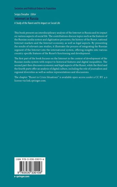 This book presents an interdisciplinary analysis of the Internet in Russia and its impact on various aspects of social life. The contributions discuss topics such as the features of the Russian media system and digitization processes, the history of the Runet, national Internet markets and the Internet economy, as well as legal aspects. By presenting the results of relevant case studies, it illustrates the process of integrating the Russian segment of the Internet into the international system, offering insights into various country-specific features of the Runet's functioning and development.