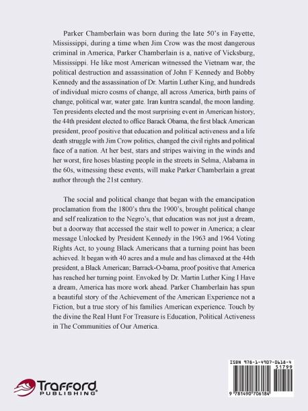 Parker Chamberlain was born during the late 50's in Fayette, Mississippi, during a time when Jim Crow was the most dangerous criminal in America, Parker Chamberlain is a, native of Vicksburg, Mississippi. He like most American witnessed the Vietnam war, the political destruction and assassination of John F Kennedy and Bobby Kennedy and the assassination of Dr. Martin Luther King, and hundreds of individual micro cosms of change, all across America, birth pains of change, political war, water gate. Iran kuntra scandal, the moon landing. Ten presidents elected and the most surprising event in American history, the 44th president elected to office Barack Obama, the first black American president, proof positive that education and political activeness and a life death struggle with Jim Crow politics, changed the civil rights and political face of a nation. At her best, stars and stripes waiving in the winds and her worst, fire hoses blasting people in the streets in Selma, Alabama in the 60s, witnessing these events, will make Parker Chamberlain a great author through the 21st century. The social and political change that began with the emancipation proclamation from the 1800's thru the 1900's, brought political change and self realization to the Negro's, that education was not just a dream, but a doorway that accessed the stair well to power in America; a clear message Unlocked by President Kennedy in the 1963 and 1964 Voting Rights Act, to young Black Americans that a turning point has been achieved. It began with 40 acres and a mule and has climaxed at the 44th president, a Black American; Barrack-O-bama, proof positive that America has reached her turning point. Envoked by Dr. Martin Luther King I Have a dream, America has more work ahead. Parker Chamberlain has spun a beautiful story of the Achievement of the American Experience not a Fiction, but a true story of his families American experience. Touch by the divine the Real Hunt For Treasure is Education, Political Activeness in The Communities of Our America.
