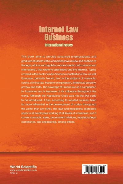 This book aims to provide advanced undergraduate and graduate students with a comprehensive review and analysis of the legal, ethical and regulatory environments, both national and international, that relate to businesses and the Internet. Topics covered in the book include American constitutional law, as well European, primarily French, law on the subjects of contracts, courts, criminal law, freedom of expression, intellectual property, privacy and torts. The coverage of French law as a comparison to American law is because of its influence throughout the world. Although the Napoleonic Code was not the first code to be introduced, it has, according to reputed sources, been far more influential in the development of codes throughout the world, than any other. The laws and regulations addressed apply to all employees working at all levels of a business, and it covers contracts, sales, government relations, regulatory/legal compliance, and engineering, among others.