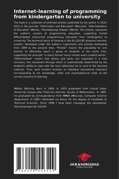 The book is a collection of selected articles published by the author in 2010-2015 in the journals "Informatics and Education" (Moscow), "Informatization of Education" (Minsk), "Pachatkovaya Shkola" (Minsk). The articles represent the author's system of programming education, supporting frontal differentiated end-to-end programming education from kindergarten to university. The technical basis of training is the DL.GSU.BY distance learning system, developed under the author's supervision and actively developing from 1999 to the present time. "Frontal" means the possibility for one teacher to effectively teach a group of students at the same time, supporting the principle 'in every lesson every minute every student works'. "Differentiated" means that theory and tasks are organized in a tree structure, the movement through which is automatically determined by the student's ability to cope with the task (otherwise he is sent to the learning subtree). Thus, each student receives an individual educational trajectory corresponding to his knowledge, skills and psychophysical state at the current moment of learning.
