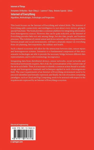 Introduction to the Internet of Everything.- Sensor systems.- Social Networks.- Biomedical Applications.- Smart cities.- Internet of Services (IoS).- IoE applications.- Data modelling and management.- Semantic technologies for IoE ecosystems.- Cloud and Fog Computing.- Standardization Efforts.- Big Data applications.- Predictive models and support to decision making.
