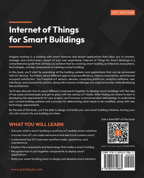 Harness the full potential of IoT in your building to improve living standards, energy efficiency, and more Purchase of the print or Kindle book includes a free PDF eBook Key Features:Discover how IoT solutions transform mechanical and electrical control systems into smart systems Unlock new revenue potential, operational efficiencies, and improved occupant's quality of life Explore industry thought leadership through author-led real-world applications and use cases Book Description: Imagine working in a building with smart features and tenant applications that allow you to monitor, manage, and control every aspect of your user experience. Internet of Things for Smart Buildings is a comprehensive guide that will help you achieve that with smart building architecture, ecosystems, technologies, and key components that create a smart building. In this book, you'll start by examining all the building systems and applications that can be automated with IoT devices. You'll learn about different apps to improve efficiency, reduce consumption, and improve occupant satisfaction. You'll explore IoT sensors, devices, computing platforms, analytics software, user interfaces, and connectivity options, along with common challenges you might encounter while developing the architecture. You'll also discover how to piece different components together to develop smart buildings with the help of use cases and examples and get to grips with the various IoT stacks. After finding out where to start developing the requirements for your project, you'll uncover a recommended methodology to understand your current building systems and a process for determining what needs to be modified, along with new technology requirements. By the end of the book, you'll be able to design and build your own smart building initiative, turning your city into a smart city with one building at a time. What You Will Learn:Discover what's a smart building and how IoT enables smart solutions Uncover how IoT can make mechanical and electrical systems smart Understand how IoT improves workflow tasks, operations, and maintenance Explore the components and technology that make a smart building Recognize how to put together components to deploy smart applications Build your smart building stack to design and develop smart solutions Who this book is for: This book is for architects, mechanical, electrical, and HVAC engineers, system integrators, facility, and operations personnel, and others looking to implement IoT solutions to make their buildings smart. Basic understanding of various mechanical and electrical building systems including HVAC, security, fire alarms, communications, and data networks as well as the operations and maintenance requirements is a prerequisite.
