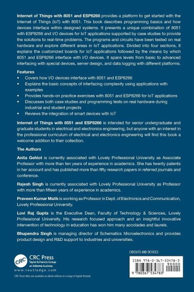 Anita Gehlot is currently associated with Lovely Professional University as Associate Professor with more than ten years of experience in academics. She has twenty patents in her account and has published more than fifty research papers in referred journals and conference. Rajesh Singh is currently associated with Lovely Professional University as Professor with more than fifteen years of experience in academics. He has been awarded as gold medallist in M.Tech and honors in his B.E. Praveen Kumar Malik is working as Professor in Dept. of Electronics and Communication, Lovely Professional University, Punjab India. He has more than 15 papers in different National and International Journals. His major area of interest includes Antenna Design, wireless Communication and Embedded systems. Lovi Raj Gupta is the Executive Dean, Faculty of Technology & Sciences, Lovely Professional University. He is a leading light in the field of Technical and Higher education in the country. His research focused approach and an insightful innovative intervention of technology in education has won him much accolades and laurels. Bhupendra Singh is Managing director of Schematics Microelectronics and provides Product design and R&D support to industries and Universities. He has published fifteen books in the area of Embedded Systems and Internet of Things with reputed publishers like CRC/Taylor & Francis, Narosa, GBS, IRP, NIPA and RI publication.