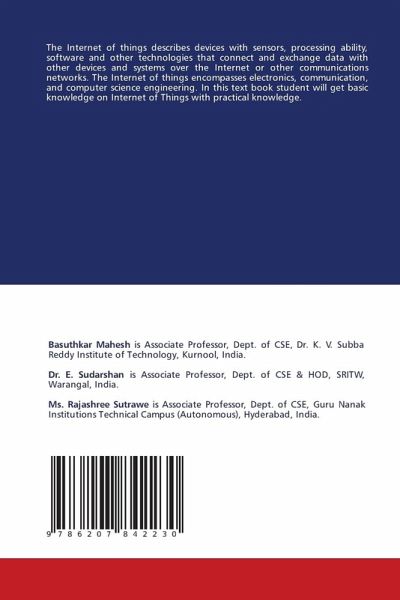 The Internet of things describes devices with sensors, processing ability, software and other technologies that connect and exchange data with other devices and systems over the Internet or other communications networks. The Internet of things encompasses electronics, communication, and computer science engineering. In this text book student will get basic knowledge on Internet of Things with practical knowledge.