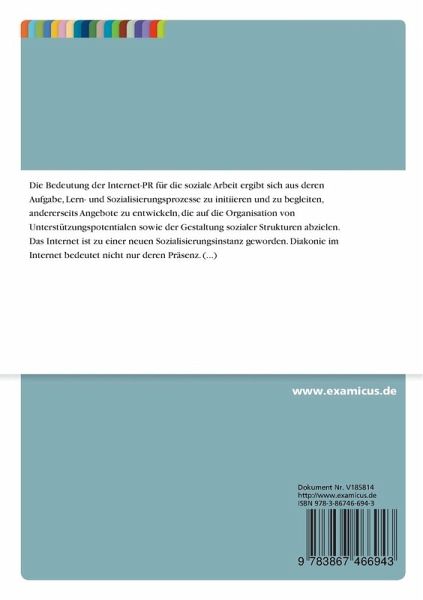 Diplomarbeit aus dem Jahr 2002 im Fachbereich Soziale Arbeit / Sozialarbeit, Note: 2, Evangelische Fachhochschule Berlin, Sprache: Deutsch, Abstract: Die Bedeutung der Internet-PR für die soziale Arbeit ergibt sich aus deren Aufgabe, Lern- und Sozialisierungsprozesse zu initiieren und zu begleiten, andererseits Angebote zu entwickeln, die auf die Organisation von Unterstützungspotentialen sowie der Gestaltung sozialer Strukturen abzielen. Das Internet ist zu einer neuen Sozialisierungsinstanz geworden.Diakonie im Internet bedeutet nicht nur deren Präsenz. Die Internet-PR einzelner Einrichtungen muss als Teil der Gesamtkommunikation der Diakonie gestaltet werden.Internet-PR geschieht im Spannungsfeld zwischen dem eigenen Anspruch und dem der Zielgruppen. Dabei sucht Internet-PR den Konsens.Die Diakonie und ihre Einrichtungen sollten die Kommunikation mit ihren Zielgruppen professionell über das Internet gestalten. Dabei muss ein Mehrwert wie Service, Information und Unterhaltung des Internets gegenüber anderen Kommunikationsmitteln geschaffen werden.