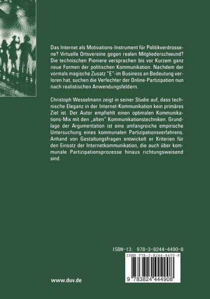 Christoph Wesselmann zeigt in seiner Studie auf, dass technische Eleganz in der Internet-Kommunikation kein primäres Ziel ist. Der Autor empfiehlt einen optimalen Kommunikations-Mix mit den "alten" Kommunikationstechniken. Grundlage der Argumentation ist eine umfangreiche empirische Untersuchung eines kommunalen Partizipationsverfahrens. Anhand von Gestaltungsfragen entwickelt er Kriterien für den Einsatz der Internetkommunikation, die auch über kommunale Partizipationsprozesse hinaus richtungweisend sind.