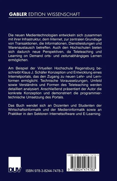 Am Beispiel der Virtuellen Hochschule Regensburg beschreibt Klaus J. Schäfer die Konzeption und Entwicklung eines Internetportals, das den Zugang zu neuen Lehr- und Lernformen ermöglicht. Die konkrete Konzeption und die programmiertechnische Umsetzung werden detailliert aufgezeigt