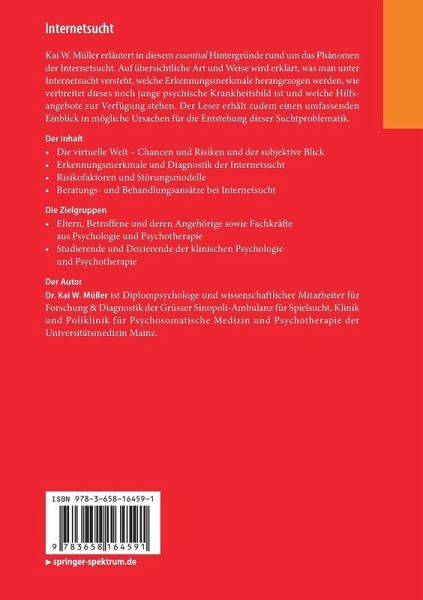 Kai W. Müller erläutert in diesem essential Hintergründe rund um das Phänomen der Internetsucht. Auf übersichtliche Art und Weise wird erklärt, was man unter Internetsucht versteht, welche Erkennungsmerkmale herangezogen werden, wie verbreitet dieses noch junge psychische Krankheitsbild ist und welche Hilfsangebote zur Verfügung stehen. Der Leser erhält zudem einen umfassenden Einblick in mögliche Ursachen für die Entstehung dieser Suchtproblematik.