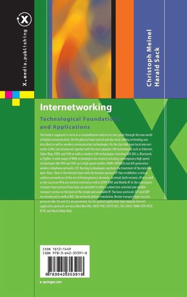 This book is supposed to serve as a comprehensive and instructive guide through the new world of digital communication. On the physical layer optical and electrical cabling technology are described as well as wireless communication technologies. On the data link layer local area networks (LANs) are introduced together with the most popular LAN technologies such as Ethernet, Token Ring, FDDI, and ATM as well as wireless LAN technologies including IEEE 802.x, Bluetooth, or ZigBee. A wide range of WAN technologies are covered including contemporary high speed technologies like PDH and SDH up to high speed wireless WANs (WiMAX) and 4th generation wireless telephone networks LTE. Routing technologies conclude the treatment of the data link layer. Next, there is the Internet layer with the Internet protocol IP that establishes a virtual uniform network out of the net of heterogeneous networks. In detail, both versions, IPv4 as well as the successor IPv6 are covered in detail as well asICMP, NDP, and Mobile IP. In the subsequent transport layer protocol functions are provided to offer a connection-oriented and reliable transport service on the basis of the simple and unreliable IP. The basic protocols TCP and UDP are introduced as well as NAT, the network address translation. Beside transport layer security protocols like SSL and TLS are presented. On the upmost application layer popular Internet application protocols are described like DNS, SMTP, PGP, (S)FTP, NFS, SSH, DHCP, SNMP, RTP, RTCP, RTSP, and World Wide Web.