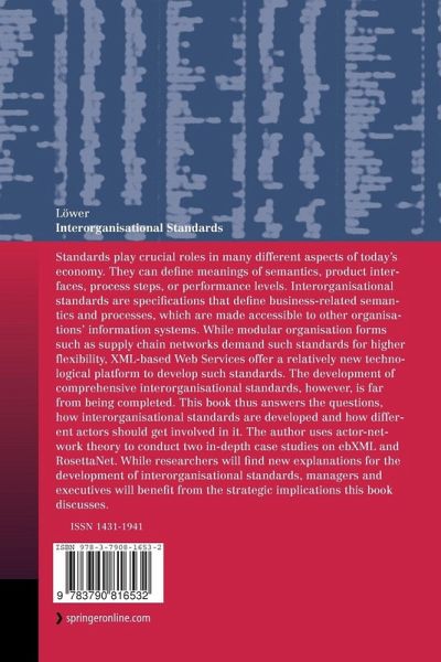 Standards play crucial roles in many different aspects of today's economy. They can define meanings of semantics, product interfaces, process steps, or performance levels. Interorganisational standards are specifications that define business-related semantics and processes, which are made accessible to other organisations' information systems. While modular organisation forms such as supply chain networks demand such standards for higher flexibility, XML-based Web Services offer a relatively new technological platform to develop such standards. The development of comprehensive interorganisational standards, however, is far from being completed. This book thus answers the questions, how interorganisational standards are developed and how different actors should get involved in it. The author uses actor-network theory to conduct two in-depth case studies on ebXML and RosettaNet. While researchers will find new explanations for the development of interorganisational standards, managers and executives will benefit from the strategic implications this book discusses.