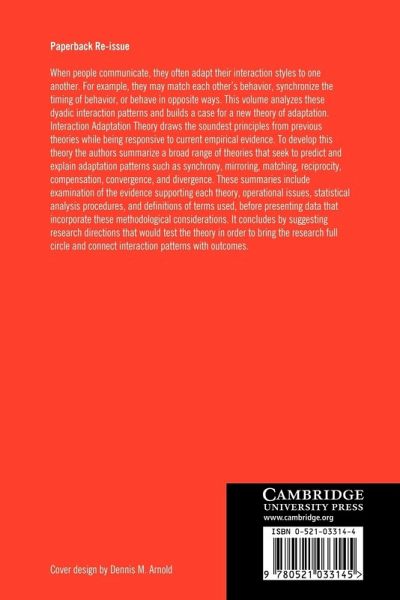 When people communicate, they often adapt their interaction styles to one another. This highly interesting book examines the numerous ways in which people do this verbally and nonverbally. It reviews theories that try to explain and predict interaction patterns and examines issues involved in conducting this kind of research. It concludes with a proposed theory, Interaction Adaptation Theory, and considers how different interaction patterns can lead to positive or negative outcomes.