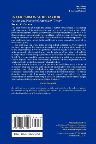 This book represents an inquiry into an area of human behavior at once fascinating and exasperating. It is fascinating because it is a class of behavior that, while peculiarly resistant to cognitive analysis and clarification it remains, for most of us throughout our lives, a subjectively crucial issue. In Interpersonal Behavior Carson analyzes, describes, and explains the transactions that occur between persons. The analysis focuses upon the smallest possible unit of social interaction, the dyad, or two-person group. This book is as important today as when it first appeared in 1969 because it forces us to recognize that attributions to others are incomplete without reference to the circumstances in which a particular behavior occurs. Carson posits that, while personality characteristics may not be ephemeral, any observed stability is the product of whatever propensities can accurately be identified as existing "inside" the person, and the interpersonal situation in which they are expressed. Carson urges us to examine more carefully the effect of noncomplementarity on what appears to be stable personality characteristics. Carson introduces us to the principal interpersonal theorists in a series of expository chapters that are both lucid and authoritative. His long experience as a clinical psychologist enables him to make a telling application of interaction concepts of personality to the field of mental and emotional "illness." He makes clear that many people designated as "mental patients" have suffered real harm because they are perceived as having a "diseased" personality, rather than as people who, under certain circumstances, behave deviantly.
