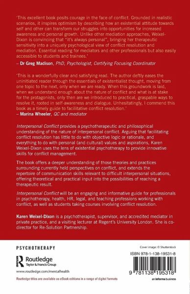 Interpersonal Conflict provides a psychotherapeutic and philosophical understanding of the nature of interpersonal conflict. Arguing that facilitating conflict resolution has little to do with objective logic or rationale, and everything to do with personal (and cultural) values and aspirations, Karen Weixel-Dixon uses the lens of existential psychotherapy to provide innovative skills for conflict management. The book offers a deeper understanding of those theories and practices surrounding currently held perspectives on conflict, and extends the repertoire of communication skills relevant to difficult interpersonal situations, offering theoretical and practical input into the possibilities of reaching a therapeutic result. Interpersonal Conflict will be an engaging and informative guide for professionals in psychotherapy, health, HR, legal and teaching professions working with conflict, as well as students taking courses involving conflict resolution.