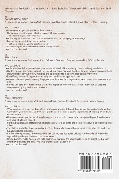 Interpersonal Feedback - 3 Manuscripts in 1 Book, Including: Conversation Skills, Small Talk and Email Etiquette. 1) CONVERSATION SKILLS: 7 Easy Steps to Master Listening Skills, Interpersonal Feedback, Difficult Conversations & Voice Training. YOU'LL LEARNHow to attract people and keep their interest Remaining receptive and reflective, even mid-conversation The enormous power of small talk Adjusting your words to match your audience without changing your message Master the art of difficult conversations Tools and tricks for you to practice alone Make sure you have something worth talking about And so much more! 2) SMALL TALK: 7 Easy Steps to Master First Impressions, Talking to Strangers, Personal Networking & Social Anxiety. YOU'LL LEARN:A detailed, explicit explanation of precisely what small talk is and why there's nothing small about it Banter, humor, and casual wit and the crucial role conversational laughter have in everyday conversations How to embrace your errors, mistakes and apologize into a positive interaction every time Identifying personality types that actually exist and how to approach them A comprehensive guide to everything you need to know to turn your every encounter into a memorable one Easy to use step-by-step methods of creating topics on which to chat, as well as section of keeping a conversation going and how to end one And so much more! 3) EMAIL ETIQUETTE: 7 Easy Steps to Master Email Writing, Business Etiquette, Email Productivity Hacks & Remote Teams. YOU'LL LEARN: · What carries over from the days of pen and paper, what is different; how to use the best of both worlds. · Controlling your emotions and when to put them into a message; the importance of cooling off and when to stay heated. · How to use use friendly, casual emails to practice your skills; closer relationships with your loved ones is one heck of a fringe benefit. · Formal, business and professional emails require a little bit extra and a little less; how to communicate like a boss. · Tips, tricks, and other time-saving habits of professionals the world over; email is decades old, and time has always been precious. · Far from being isolated, remote workers can collaborate like never before; use the tools of the modern age to bridge the gap between distant workers. · Beyond office emails, conference calls, and video chats are the whole wide world of digital media; take your new skills past the next level into another game altogether. · And so much more!