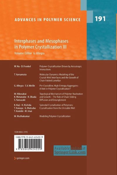 W. Hu, D. Frenkel: Polymer Crystallization Driven by Anisotropic Interactions.- T. Yamamoto: Molecular Dynamics Modeling of the Crystal-Melt Interfaces and the Growth of Chain Folded Lamellae.- G. Allegra, S.V. Meille: Pre-Crystalline, High-Entropy Aggregates: A Role in Polymer Crystallisation?- M. Hikosakai, K. Watanabe, K. Okada, S. Yamazaki: Topological Mechanism of Polymer Nucleation and Growth - The Role of Chain Sliding Diffusion and Entanglement.- K. Kaji, K. Nishida, T. Kanaya, G. Matsuba, T. Konishi, M. Imai: Spinodal Crystallzation of Polymers: Crystallization from the Unstable Melt.- M. Muthukumar: Modeling Polymer Crystallization.
