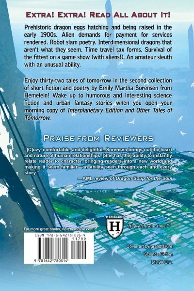 Extra! Extra! Read All About It! Prehistoric dragons eggs hatching and being raised in the early 1900s. Alien demanding payment for services rendered. Robot slam poetry. Interdimensional dragons that aren't what they seem. Time travel tax forms. Survival of the fittest on a game show (with aliens!). An amateur sleuth with an unusual ability. Enjoy thirty-two tales of tomorrow in the second collection of short fiction and poetry from Emily Martha Sorensen from Hemelein! Wake up to humorous and interesting science fiction and urban fantasy stories when you open your morning copy of Interplanetary Edition and Other Tales of Tomorrow.