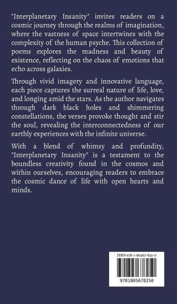 "Interplanetary Insanity" invites readers on a cosmic journey through the realms of imagination, where the vastness of space intertwines with the complexity of the human psyche. This collection of poems explores the madness and beauty of existence, reflecting on the chaos of emotions that echo across galaxies. Through vivid imagery and innovative language, each piece captures the surreal nature of life, love, and longing amid the stars. As the author navigates through dark black holes and shimmering constellations, the verses provoke thought and stir the soul, revealing the interconnectedness of our earthly experiences with the infinite universe. With a blend of whimsy and profundity, "Interplanetary Insanity" is a testament to the boundless creativity found in the cosmos and within ourselves, encouraging readers to embrace the cosmic dance of life with open hearts and minds.