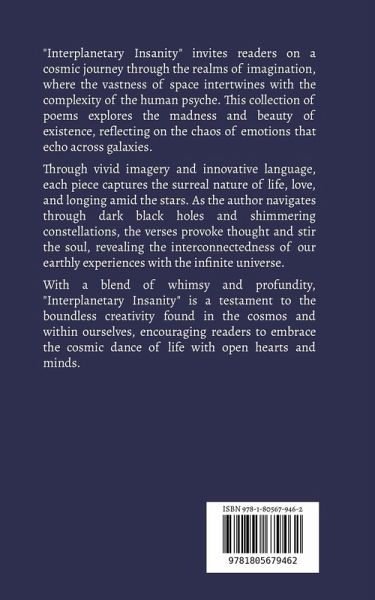 "Interplanetary Insanity" invites readers on a cosmic journey through the realms of imagination, where the vastness of space intertwines with the complexity of the human psyche. This collection of poems explores the madness and beauty of existence, reflecting on the chaos of emotions that echo across galaxies. Through vivid imagery and innovative language, each piece captures the surreal nature of life, love, and longing amid the stars. As the author navigates through dark black holes and shimmering constellations, the verses provoke thought and stir the soul, revealing the interconnectedness…mehr