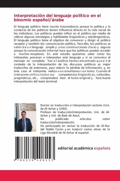 El lenguaje político tiene mucha trascendencia porque la política y la conducta de los políticos tienen influencia directa en la vida social de los individuos. Los políticos pueden influir en el público por medio de utilizar algunas estrategias y habilidades lingüísticas y extralingüísticas. El lenguaje político tiene el objetivo de convencer y dirigir al público receptor y también dar comunicación política. Para ello, los políticos se valen de un lenguaje simple y unas construcciones claras y seguras porque la comunicación informal hace que los políticos puedan acceder a muchos receptores. En este estudio queremos saber cómo los intérpretes procesan e interpretan este lenguaje y si se comunica el mensaje en completo. Tras el análisis hemos encontrado que en el contexto de la interpretación de los discursos políticos es mejor traducirlos de antemano, para reducir la pérdida de información, y, en este caso el intérprete realiza una simultánea con texto. Cuando el intérprete utiliza todas sus competencias lingüísticas, culturales, pragmáticas, etc., comprenderá bien el texto original y hará buena interpretación del texto terminal.