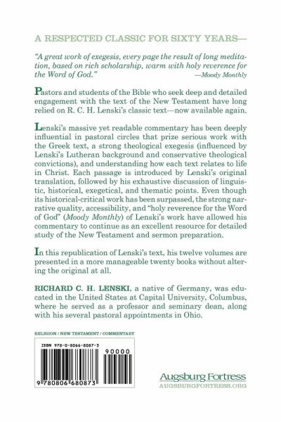 Pastors and students of the Bible who seek deep and detailed engagement with the text of the New Testament have long relied on R. C. H. Lenski's classic text _ now available again. Lenski's massive yet readable commentary has been deeply influential in pastoral circles that prize serious work with the Greek text, a strong theological exegesis (influenced by Lenski's Lutheran background and conservative theological convictions), and understanding how each text relates to life in Christ. Each passage is introduced by Lenski's original translation, followed by his exhaustive discussion of linguistic, historical, exegetical, and thematic points. Even though its historical-critical work has been surpassed, the strong narrative quality, accessibility, and "holy reverence for the the Word of God" (Moody Monthly) of Lenski's work have allowed his commentary to continue as an excellent resource for detailed study of the New Testament and sermon preparation. In this republication of Lenski's text, his twelve volumes are presented in a more manageable twenty books without altering the original at all.