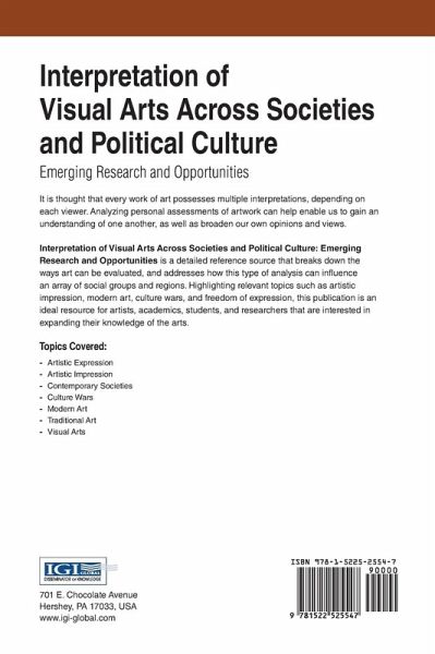 It is thought that every work of art possesses multiple interpretations, depending on each viewer. Analyzing personal assessments of artwork can help enable us to gain an understanding of one another, as well as broaden our own opinions and views. Interpretation of Visual Arts Across Societies and Political Culture: Emerging Research and Opportunities is a detailed reference source that breaks down the ways art can be evaluated, and addresses how this type of analysis can influence an array of social groups and regions. Highlighting relevant topics such as artistic impression, modern art, culture wars, and freedom of expression, this publication is an ideal resource for artists, academics, students, and researchers that are interested in expanding their knowledge of the arts.