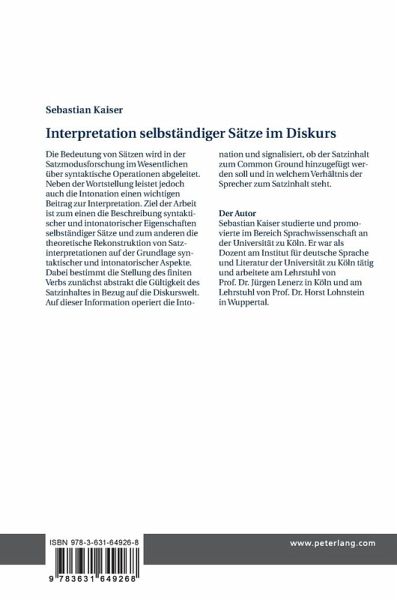 Die Bedeutung von Sätzen wird in der Satzmodusforschung im Wesentlichen über syntaktische Operationen abgeleitet. Neben der Wortstellung leistet jedoch auch die Intonation einen wichtigen Beitrag zur Interpretation. Ziel der Arbeit ist zum einen die Beschreibung syntaktischer und intonatorischer Eigenschaften selbständiger Sätze und zum anderen die theoretische Rekonstruktion von Satzinterpretationen auf der Grundlage syntaktischer und intonatorischer Aspekte. Dabei bestimmt die Stellung des finiten Verbs zunächst abstrakt die Gültigkeit des Satzinhaltes in Bezug auf die Diskurswelt. Auf dieser Information operiert die Intonation und signalisiert, ob der Satzinhalt zum Common Ground hinzugefügt werden soll und in welchem Verhältnis der Sprecher zum Satzinhalt steht.