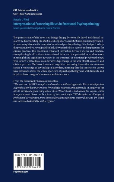 The primary aim of this book is to bridge the gap between lab-based and clinical research by disseminating the latest interdisciplinary scientific findings on interpretational processing biases in the context of emotional psychopathology. It is designed to help the practitioner by drawing explicit links between the basic science and implications for clinical practice. This enables an enhanced interaction between science and practice, strengthening bi-directional translational links, and the potential to produce more meaningful and significant advances in the treatment of emotional psychopathology. This in turn will facilitate an innovative step-change in the area of both research and clinical practice. The book focuses on cognitive processing biases that are common across a wide range of psychological disorders, meaning that the conclusions drawn have relevance across the whole spectrum of psychopathology and will stimulate and inspire a broad range of discussions and future work.