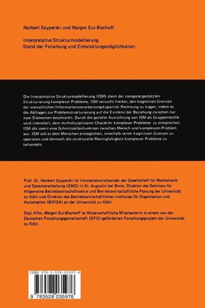 F. Zusammenfassung ISM ist eine Strukturmodellierungs-Technik, die es einer kleinen Gruppe ermöglicht, ohne übertriebenen Aufwand, auf systematische Weise und computergestützt, mit gewissen Ein schränkungen bezüglich Objektsystemabbildung und Prozeßflexi bilität, ein komplexes Problem umfassender zu verstehen und zu handhaben. Es verbleibt jedoch eine Vielzahl interessanter ISM-Forschungsfragestellungen, die die Aufmerksamkeit eines breiten Forscherpotentials auf sich ziehen sollten. Es ist wünschenswert, daß die Verbreitung von theoretischen Beiträ gen und Anwendungserfahrungen den Kreis der Interessenten zur weiteren Entwicklung und Anwendung dieser Technik ver 1 größern möge ). Ein Schritt in diese Richtung wird mit dem hier vorliegenden Bericht angestrebt. 1) Vgl. Malone 1I8MI 771. Li teraturverzei chn i s 137 Uteraturverzeichnis Arnstein, S.R.; IPerspeotivesl Christakis, A.N. (Eds.) Perspeotives on Technology Assessment. Jerusalem 1975. Bamberg, G.; IEntscheidungslehrel Coenenberg, G. Betriebswirtschaftliche Ent sCheidungslehre. Manchen 1974. Braud, D. H ; IImplementationl Irvin, D.M.; Implementation of Interpretive Kawamura, K. Structural Modeling in a State Level Planning Context. In: Pro ceedings of the 7. Pittsburgh Conferenoe on Modeling and Si mulation. Instrument Society of America. Pittsburgh 1976, S. 1152 - 1157. Brill, E.j ISysteml Clendening, G. u.a. The Interpretive Structural Modeling System, Vol. I: User's Guide. Batteile Columbus Labora tories, Maroh 31, 1975. Christakis, A.N. IAppreciationl Toward a Symbiotic Apprecia tion of the Morphology of Human Settlements. In: Baldwin, M.M. (Ed.): Portraits of Complexity: Applications of Systems Methodo logies to Societal Problems. Batteile Memorial Institute, 1975, S. 160 - 178.