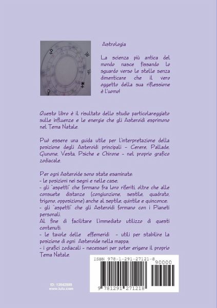 L'argomento trattato in questo testo è incentrato sull'interpretazione degli Asteroidi nel Tema Natale. Il tema è stato trattato considerando: l'analisi delle posizioni di Cerere, Pallade, Giunone, Vesta, Psiche e Chirone nei segni e nelle case; l'osservazione degli "aspetti" che gli asteroidi formano fra loro riferiti oltre che alle consuete distanze (congiunzione, sestile, quadrato, trigono, opposizione) anche al septile, quintile e quinconce; l'esame gli "aspetti" che gli asteroidi formano con i Pianeti personali; Per una maggior facilitazione dell'interpretazione, sono elencate le tavole delle effemeridi - al fine di stabilire la posizione di ogni asteroide nella mappa; i grafici zodiacali - per poter erigere la propria mappa. Questi ultimi strumenti indispensabili per poter analizzare velocemente la posizione ed il significato dei propri Asteroidi.