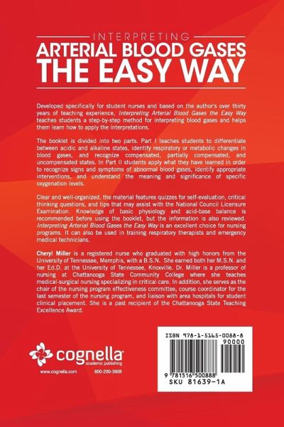 Developed specifically for student nurses and based on the author's over thirty years of teaching experience, Interpreting Arterial Blood Gases the Easy Way teaches students a step-by-step method for interpreting blood gases and helps them learn how to apply the interpretations. The booklet is divided into two parts. Part I teaches students to differentiate between acidic and alkaline states, identify respiratory or metabolic changes in blood gases, and recognize compensated, partially compensated, and uncompensated states. In Part II students apply what they have learned in order to recognize signs and symptoms of abnormal blood gases, identify appropriate interventions, and understand the meaning and significance of specific oxygenation levels. Clear and well-organized, the material features quizzes for self-evaluation, critical thinking questions, and tips that may assist with the National Council Licensure Examination. Knowledge of basic physiology and acid-base balance is recommended before using the booklet, but the information is also reviewed. Interpreting Arterial Blood Gases the Easy Way is an excellent choice for nursing programs. It can also be used in training respiratory therapists and emergency medical technicians.