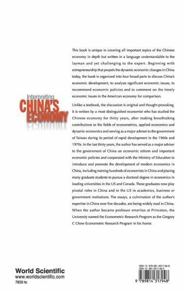 This book is unique in covering all important topics of the Chinese economy in depth but written in a language understandable to the layman and yet challenging to the expert. Beginning with entrepreneurship that propels the dynamic economic changes in China today, the book is organized into four broad parts to discuss China's economic development, to analyze significant economic issues, to recommend economic policies and to comment on the timely economic issues in the American economy for comparison. Unlike a textbook, the discussion is original and thought-provoking. It is written by a most distinguished economist who has studied the Chinese economy for thirty years, after making breathtaking contributions to the fields of econometrics, applied economics and dynamic economics and serving as a major adviser to the government of Taiwan during its period of rapid development in the 1960s and 1970s. In the last thirty years, the author has served as a major adviser to the government of China on economic reform and important economic policies and cooperated with the Ministry of Education to introduce and promote the development of modern economics in China, including training hundreds of economists in China and placing many graduate students to pursue a doctoral degrees in economics in leading universities in the US and Canada. These graduates now plays pivotal roles in China and in the US in academics, business or government institutions. The essays, a culmination of the author's expertise in China over five decades, are being widely read in China. When the author became professor emeritus at Princeton, the University named the Econometric Research Program as the Gregory C Chow Econometric Research Program in his honor.