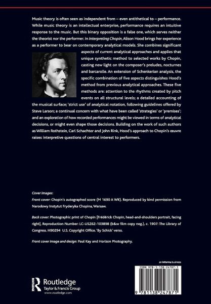 Music theory is often seen as independent from - even antithetical to - performance. While music theory is an intellectual enterprise, performance requires an intuitive response to the music. But this binary opposition is a false one, which serves neither the theorist nor the performer. In Interpreting Chopin Alison Hood brings her experience as a performer to bear on contemporary analytical models. She combines significant aspects of current analytical approaches and applies that unique synthetic method to selected works by Chopin, casting new light on the composer's preludes, nocturnes and barcarolle. An extension of Schenkerian analysis, the specific combination of five aspects distinguishes Hood's method from previous analytical approaches. These five methods are: attention to the rhythms created by pitch events on all structural levels; a detailed accounting of the musical surface; 'strict use' of analytical notation, following guidelines offered by Steve Larson; a continual concern with what have been called 'strategies' or 'premises'; and an exploration of how recorded performances might be viewed in terms of analytical decisions, or might even shape those decisions. Building on the work of such authors as William Rothstein, Carl Schachter and John Rink, Hood's approach to Chopin's oeuvre raises interpretive questions of central interest to performers.