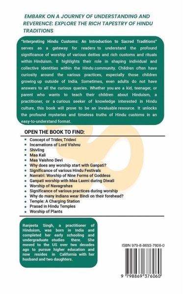 "Interpreting Hindu Customs: An Introduction to Sacred Traditions" serves as a gateway for readers to understand the profound significance of worship of various deities and rich customs and rituals within Hinduism. Hinduism is the third-largest religion in the world. This book navigates through the intricate set of Hindu customs, shedding light on their origins, evolution and symbolic meanings. From worship rituals to festival celebrations to personal devotions, each custom is examined with sensitivity and reverence, highlighting its role in shaping individual and collective identities within the Hindu community. As an introductory guide, "Interpreting Hindu Customs" invites readers on a transformative journey of discovery, inviting them to explore the timeless wisdom embedded within these sacred traditions. Children often have curiosity around the various practices, especially those children growing up outside of India. Sometimes, even adults do not have answers to all the curious queries. Whether you are a kid or a teenager or parent of kids who wants to teach their kids about Hinduism or practitioner or curious seeker of knowledge interested in Hindu culture, this book would prove to be an invaluable resource for unlocking the profound mysteries and timeless truths of Hindu customs in an easy to understand format.