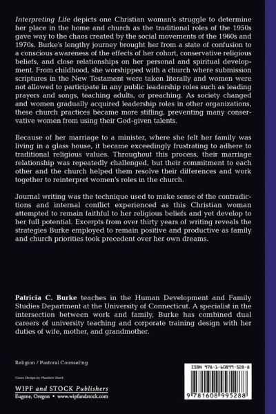 Interpreting Life depicts one Christian woman's struggle to determine her place in the home and church as the traditional roles of the 1950s gave way to the chaos created by the social movements of the 1960s and 1970s. Burke's lengthy journey brought her from a state of confusion to a conscious awareness of the effects of her cohort, conservative religious beliefs, and close relationships on her personal and spiritual development. From childhood, she worshipped with a church where submission scriptures in the New Testament were taken literally and women were not allowed to participate in any public leadership roles such as leading prayers and songs, teaching adults, or preaching. As society changed and women gradually acquired leadership roles in other organizations, these church practices became more stifling, preventing many conservative women from using their God-given talents. Because of her marriage to a minister, where she felt her family was living in a glass house, it became exceedingly frustrating to adhere to traditional religious values. Throughout this process, their marriage relationship was repeatedly challenged, but their commitment to each other and the church helped them resolve their differences and work together to reinterpret women's roles in the church. Journal writing was the technique used to make sense of the contradictions and internal conflict experienced as this Christian woman attempted to remain faithful to her religious beliefs and yet develop to her full potential. Excerpts from over thirty years of writing reveals the strategies Burke employed to remain positive and productive as family and church priorities took precedent over her own dreams.