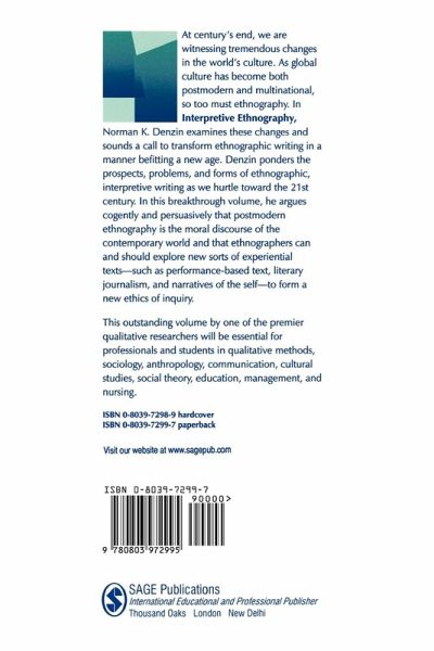 As the world's culture has become both postmodern and multinational, so too must ethnography. In this volume, Norman K Denzin examines the changes and sounds a call to transform ethnographic writing in a manner befitting a new age. The author ponders the prospects, problems and forms of ethnographic interpretive writing in the twenty-first century. He argues cogently and persuasively that postmodern ethnography is the moral discourse of the contemporary world, and that ethnographers can and should explore new types of experimental texts - performance-based texts, literary journalism and narratives of the self - to form a new ethics of inquiry.