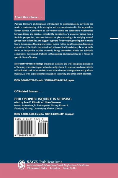 Patricia Benner's introduction to phenomenology develops the reader's understanding of the strategies and processes involved in this innovative approach to nursing. The author discusses the relationship between theory and practice, considers the possibility of a science of caring from a feminist perspective, introduces interpretive phenomenology to the study of natural groups such as families, and suggests a basis for developing nursing ethics that is true to the caring and healing practices of the nursing profession.