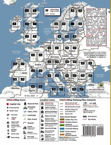 Interrail/Eurail Icon Illustrated Railway Atlas - Global Pass Edition is an illustrated Railway Atlas. The simplified Railway Network Map includes Icons, Info and photographs to enable you to make the very most of your time in Europe and get very most benefit from your RailPass. Atlas covers all 33 European counties included in Eurail/Interrail Global Rail Pass plus Moldova, Albania and North African and all the major Mediterranean, Scandinavian, Irish and UK ferry routes. . Planning an epic Interrail/Eurail adventure is always a difficult choice and compromise with an infinite number of possible routes and fabulous locations to visit and explore. Global Pass Edition of InfoRailMap Atlas - 'Info Graphic' highlights all major UNESCO listed sites, Roman artefacts including Amphitheatre, Castles, Palaces, Hill-top Citadels/fortifications, Aqueducts/bridges, spiritual buildings including Cathedrals, Mosques, Monasteries and Abbeys, Museums/art galleries, impressive large Statues and attractive Old World Medieval towns, National Parks and protected landscapes so you know instantly where to focus your time and which routes best suit your interests. There is an HUGE amount information contained within the Infographic and it is completely JAMMED PACKED with awesome locations, tips, highlighted scenic routes, Islands, ferry route info, physical size of major mountains and, for some, this may be a problem if you want something very basic to understand in an instant! We love creating and continually improving this InfoGraphic/Atlas/planning tool and we really want you to be 100% super happy with your purchase and do not want you to be disappointed when you receive your Interrail/Eurail Illustrated Railway Atlas .. Please read the following so you know EXACTLY what you can expect: - All main railway lines. - Routes which require additional seat reservations and supplements (orange highlights). Eg TGV and Eurostar. - Easy identification of the most awesome scenic routes (green highlights). - Branded Swiss scenic routes are identified with special-coloured highlights - All the most popular tourist destination, Capital Cities and major towns on the entire network are highlights in large bold print. - Ski resorts and popular summer hiking destinations. - Ports and popular ferry routes including info on many of the massive RailPass holder discounts for example travelling between Sweden and Finland or between the UK and Ireland. - Clear identification of major National Parks and areas of outstanding beauty. - Airports (with red highlighted airport codes). - Sandy beaches and stunning coastlines. - Mountain ranges including height in meters - A-Z grid/page index for easy identification of all major tourist locations and acts a go-to list of all major must-visit tourist destinations. - European currency guide p29. - Handy back page Atlas Icon Legend and European Map with country names including Atlas page numbers. - Glossy and durable laminated cover and easy to fold/pack A4 Letter format and PREMIUM COLOUR Interior. - Accompanying websites: www.InfoRailMap.com Interrail/Eurail Icon Illustrated Railway Atlas has been specifically designed as easy and quick reference with clear indication of all major stops and top notch tourist destinations to include in your plans for the entire European Railway Network (Global RailPass) in an easy to pack away format with full colour A4 durable quality paper plus long lasting laminated glossy cover. The large A4 letter paperback format includes duplications to enable super easy route planning.