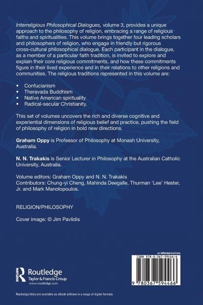 Interreligious Philosophical Dialogues, volume 3, provides a unique approach to the philosophy of religion, embracing a range of religious faiths and spiritualities. This volume brings together four leading scholars and philosophers of religion, who engage in friendly but rigorous cross-cultural philosophical dialogue. Each participant in the dialogue, as a member of a particular faith tradition, is invited to explore and explain their core religious commitments, and how these commitments figure in their lived experience and in their relations to other religions and communities. The religious traditions represented in this volume are: ¿Confucianism ¿Theravada Buddhism ¿Native American spirituality ¿Radical-secular Christianity. This set of volumes uncovers the rich and diverse cognitive and experiential dimensions of religious belief and practice, pushing the field of philosophy of religion in bold new directions.