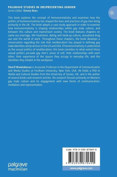 This book explores the concept of homonormativity and examines how the politics of homonormativity has shaped the lives and practices of gay men living primarily in the UK. The book adopts a case study approach in order to examine how homonormativity is shaping relationships within gay male culture, and between this culture and mainstream society. The book features chapters on same-sex marriage, HIV treatment, dating and hook-up culture, sexualized drug use and the world of work. Throughout these chapters, the book develops a conversation regarding the role that neoliberalism has played in defining gay male identities and practices in the UK and USA. If homonormativity is understood as the sexual politics of neoliberalism, this book considers to what extent those sexual politics pervade gay men's sense of self, their relationships with each other, their experience of the spaces they occupy in everyday life, and the identities they inhabit in the workplace.blematizing the concept of homonormativity.