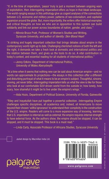 "If, in the time of imperialism, 'peace' truly is just a moment between ongoing wars of exploitation, then Interrogating Empire offers us hope in that bleak landscape. The world-ranging essays in this anthology give us cogent analyses of the connections between U.S. economic and military power, and patterns of neo-colonialism and capitalist expansion around the globe. But, more importantly, the writers offer historical examples and critical thoughts on how we who are in opposition to this system can build solidarity and link our power across boundaries of nation, gender, and class." - Minnie Bruce Pratt, Professor of Women's Studies and Writing, Syracuse University, and author of Identity: Skin Blood Heart"A striking and hugely important collection that brings debates about empire in the contemporary world right up to date. Challenging cherished notions of both left and right, it demands we take a fresh look at domestic and international politics and the relation between them, and gives us the tools to do so. A vital contribution in today's context, and essential reading for all students of international politics." - Jenny Edkins, University of Wales Aberystwyth"At a time when it seems that nothing new can be said about American empire - and no words can approximate its projections - the essays in this collection offer a different and disturbing portrayal of what it means to be an empire's subject. Thoughtful, sincere, moving, yet never bitter, Interrogating Empire tells us what the world may look like to those who look at our comfortable SUV-driven world from the outside in; how lonely, how scary, how shameful it might be to live under the empire's wings." - Aida Hozic, University of Florida, Gainesville"Riley and Inayatullah have put together a powerful collection. Interrogating Empire challenges specific disciplines, all academics,and indeed,all Americans to move beyond chosen 'willful ignorance,' to understand how they are complicit in the construction of the US empire. The contributing authors in this very commanding collection show readers that US imperialism is internal as well as external most recently exemplified byits apartheid society treatment ofpoor peoplein New Orleans after hurricane Katrina and its expanding occupation in the Middle East.There is, therefore, no 'us' and 'them,'as successive US administrations try to project and have convincedmost Americans. Readers will come to understand how and why the US state could simultaneously repress democracy and freedom in the US, while claiming topromote it in the Middle East. Interrogating Empire challenges usto do something if we really care to stop US empire-building in both its ideology and action. The authors ask us to do the interrogation of empire with them, to open our minds to a more expansive way of knowing, andto use our collective voice to stop the fast encroaching police state that is in the making in the US. The empire requires internal strength to have external force.As the authors show, the empire should be stopped, it can be stopped, and it must be stopped. This book is a must read." - Linda Carty, Africana Studies, Syracuse University
